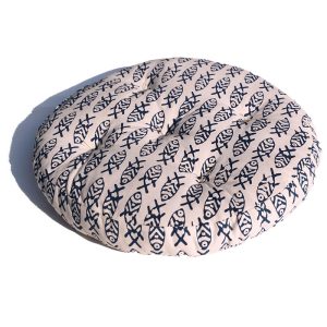 Rundes Sitzkissen in den Farben Creme und Blau mit bedruckten Fischen. Überzug (nicht abnehmbar): 100% Baumwolle, Füllung: Baumwolle, D45cm.