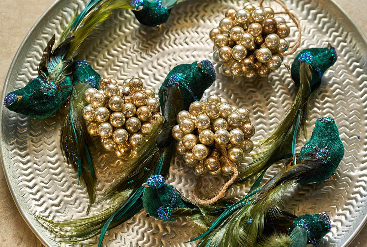 Kugel transparent mit Blättern aus Samt und Glitzer; DM: 8cm.