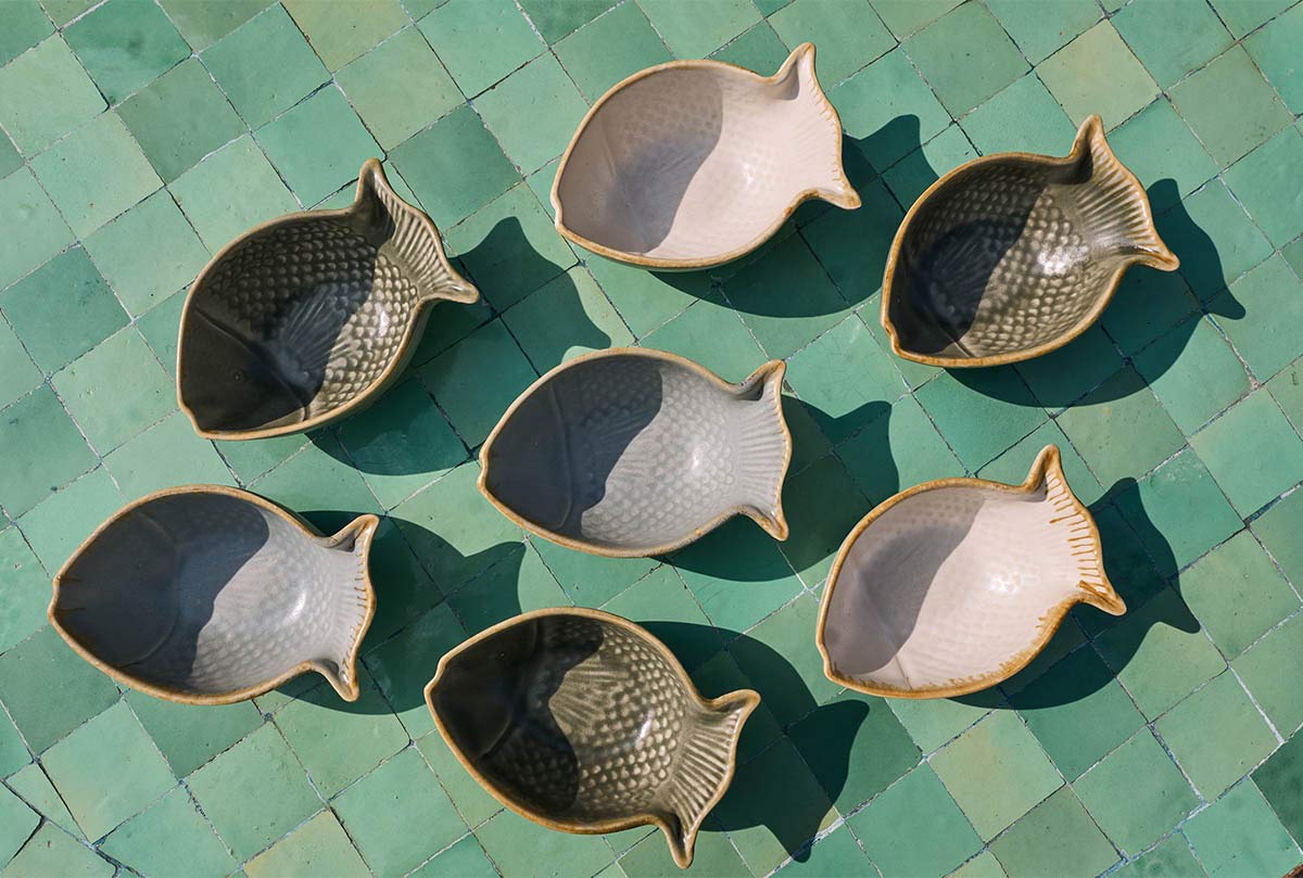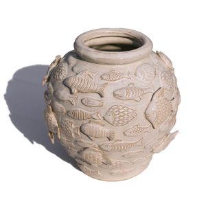Steingutvase in Cremeweiß mit applizierten Fischen. D28x27cm.