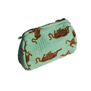 Gesteppter Baumwoll-Kultubeutel mit handgefertiger Quaste in den Farben Türkis und Braun. Material: Baumwolle/Polyester, Schonwaschgang bei 30 Grad, Größe: 20x8x10cm