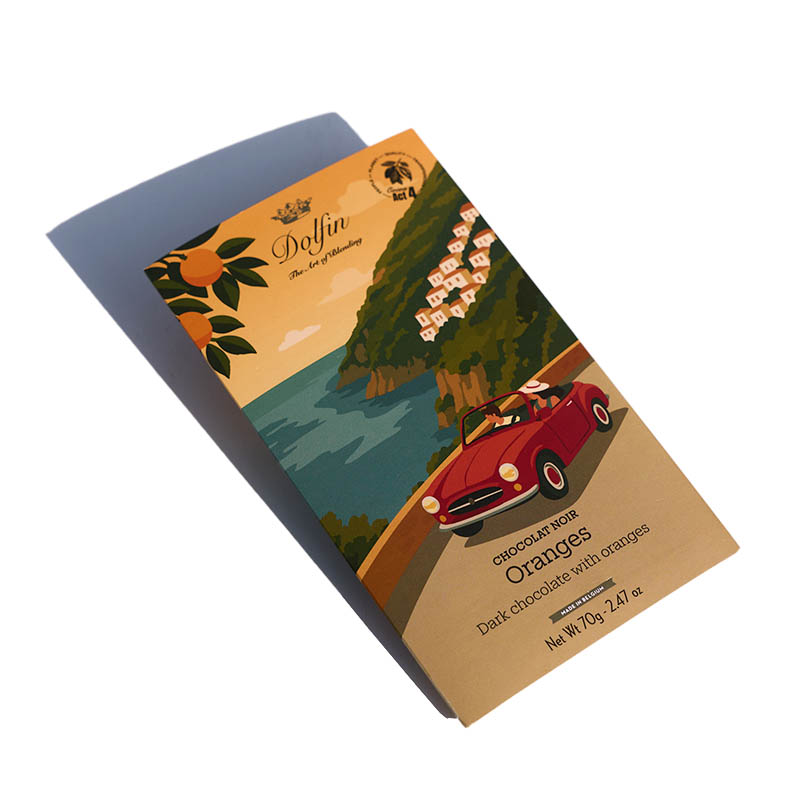 Dunkle Schokolade, 60%, mit Orangen. Herkunft: Belgien, 70g.